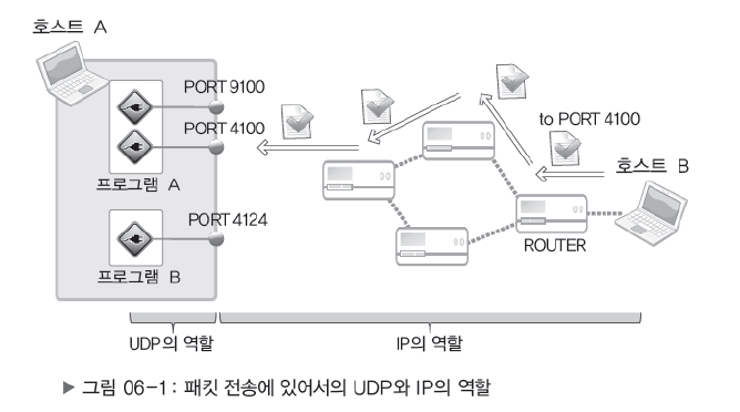 위 그림에서 보이듯이 호스트 B를 떠난 UDP 패킷이 호스트 A에게 전달되도록 하는 것은 IP의 역할이다. 그런데 이렇게 전달된 UDP 패킷을 호스트 A내에 존재하는 UDP 소켓 중 하나에게 최종 전달하는 것은 IP의 역할이 아니다. 이는 바로 UDP의 역할이다. 즉, UDP의 역할 중 가장 중요한 것은 호스트로 수신된 패킷을 PORT 정보를 참조하여 최종 목적지인 UDP 소켓에 전달하는 것이다.
