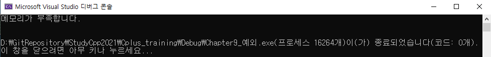 throw는 char *를 받는 catch문으로 점프하여 에러 메세지를 출력하고 전체 블록이 종료된다.