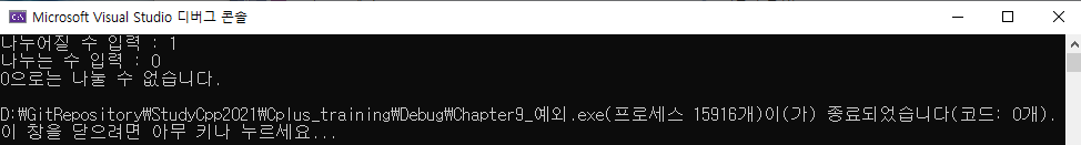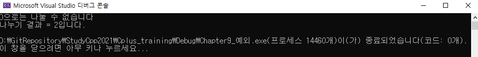 첫 번째 호출은 의도적으로 0을 전달하여 예외를 일으켰다. divide의 throw 구문은 호출원으로 돌아와 대응되는 catch문을 찾아 예외를 처리한다. 함수에서 문자열을 던졌으므로 나눌 수 없다는 에러 메세지가 출력된다.