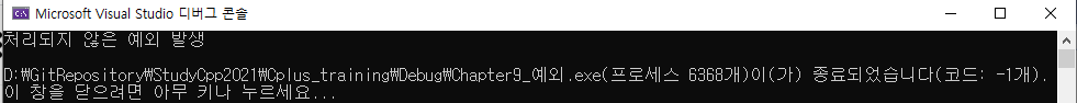 아무도 처리하지 않는 예외는 termivate 함수가 처리하며 내부적으로 abort 함수를 호출하여 프로그램을 강제 종료한다.